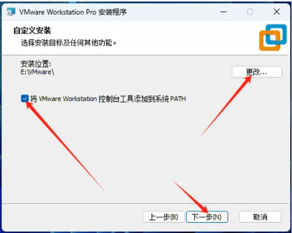 第6步、更改选择自己想要安装的位置然后勾选将 VMware Workstation控制台工具添加到系统PATH,后点击下一步