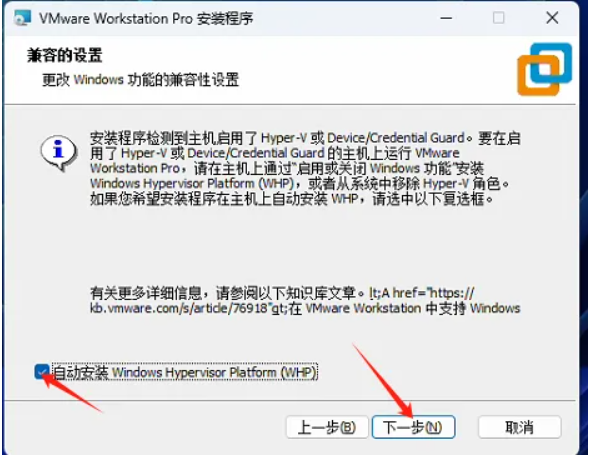第5步、勾选自动安装Windows Hypervisor Platform (WHP)后点击下一步