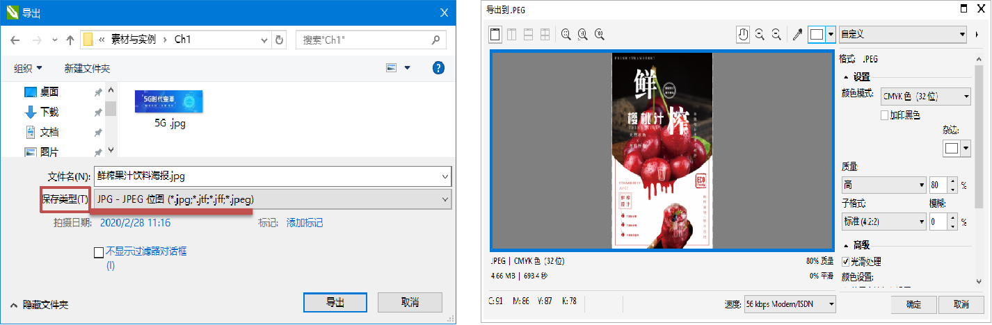 例如,在“保存类型”下拉列表中选择“JPG-JPEG位图”项,其他参数保持默认。单击“导出”按钮,在弹出的“导出到JPEG”对话框中设置位图的相关参数,此处保持默认设置,然后单击“确定”按钮,即可将文档以.jpg格式导出到指定位置,如图所示。