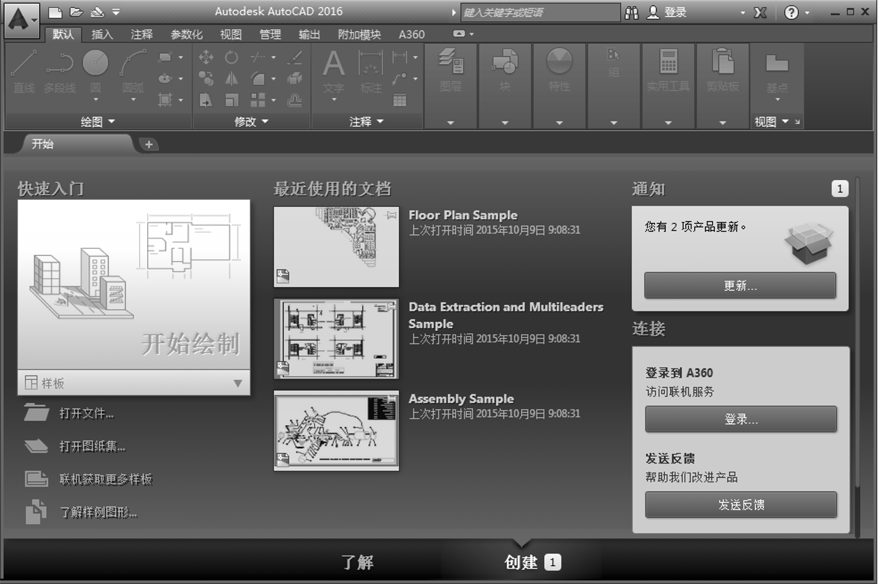 “快速入门”选项组: 在此选项组中可以执行“开始绘制”“打开文件”“打开图纸集”“联机获取更多样板”和“了解样例图形”等操作命令。 “最近使用的文档”列表: 列出了最近使用过的文档,单击某一文档可快速打开该文档。 “通知”区: 显示与产品更新、硬件加速,以及脱机帮助文件等相关的信息。 “连接”区: 可登录到A360访问联机服务,也可以发送反馈以帮助改进产品。