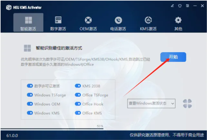 4、然后打开下载的HEU_KMS_Activator_v61.0.0文件,然后点击开始