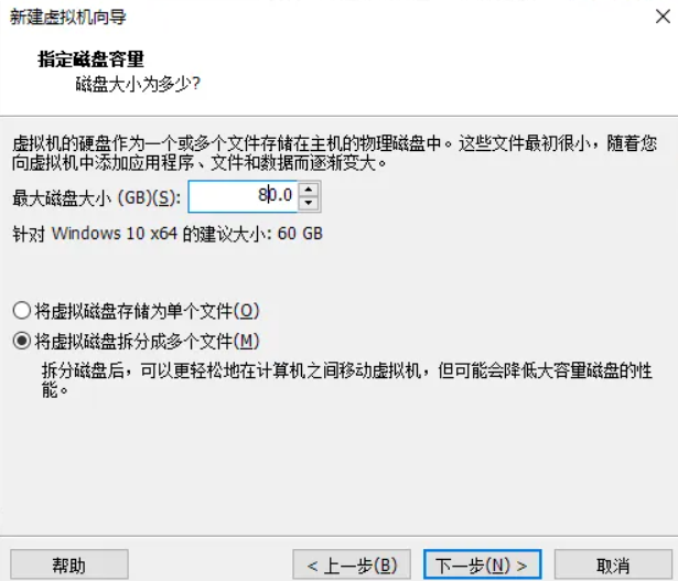 第9步、输入最大磁盘大小,默认的是60GM,我这里改成80GB,玩一般的游戏是够用了,这里具体大小还需要根据你的硬盘大小来输入。然后点击“下一步”