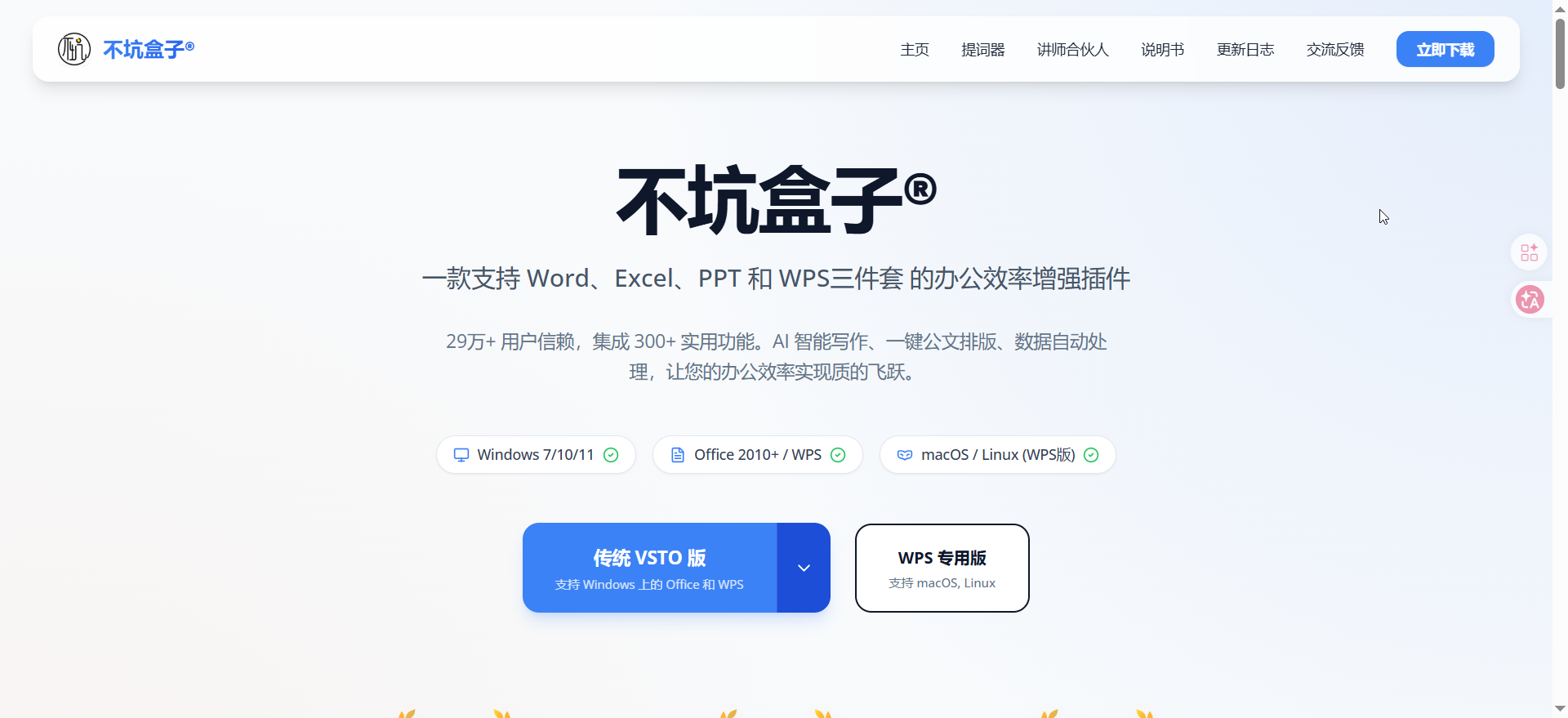 不坑盒子®不止是一款办公插件,更是29万+用户的高效办公搭子,它以全域兼容打破版本局限,以300+实用功能破解办公痛点,以高性价比惠及全民,以过硬口碑赢得信赖,更以全新独立产品拓展办公创作边界。无论是职场新人还是资深从业者,无论是行政、财务、教师还是科研人员,无论使用Windows、macOS还是Linux系统,不坑盒子®都能精准匹配需求,帮你省去80%的无效办公时间,摆脱办公内耗,让办公从“繁琐费力”走向“轻松高效”。