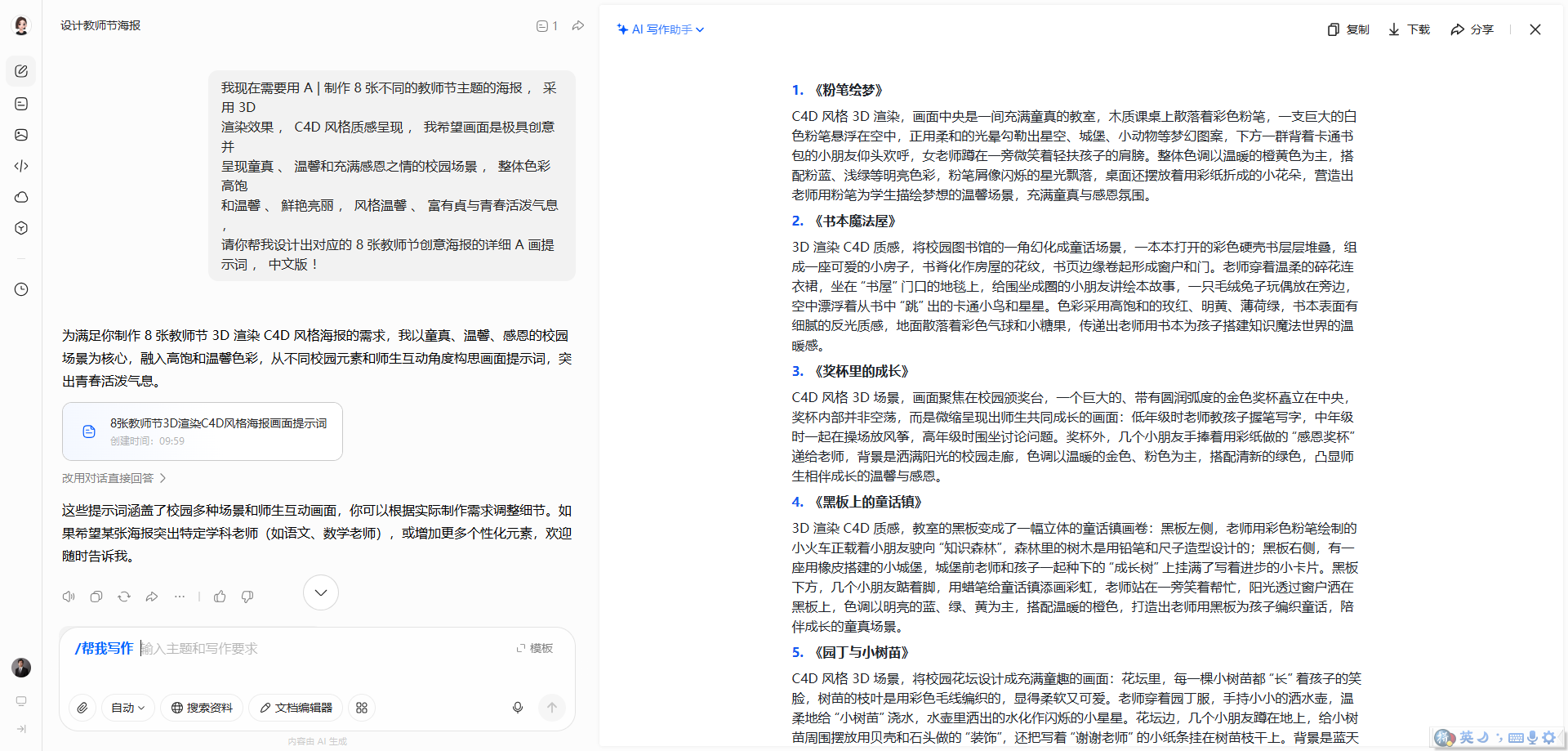 可以看到,豆包按要求一次性给我们生成了8个教师节主题的海报提示词。